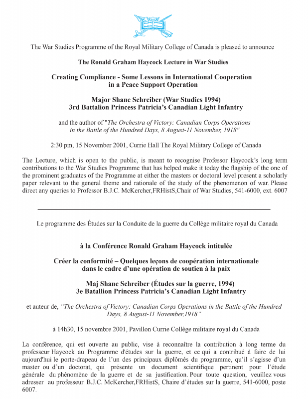 The Lecture, which is open to the public, is meant to recognise Professor Haycock’s long term contributions to the War Studies Programme that has helped make it today the flagship of the one of the prominent graduates of the Programme at either the masters or doctoral level present a scholarly paper relevant to the general theme and rationale of the study of the phenomenon of war. Please direct any queries to Professor B.J.C. McKercher, FRHistS, Chair of War Studies, 541-6000, ext. 6007