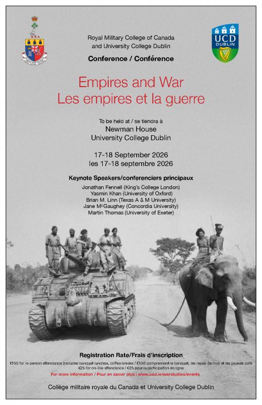 L’University College Dublin et le Collège militaire royal du Canada organise conjointement une conférence consacrée aux différentes facettes de la guerre et de l’empire depuis l’Antiquité. L’événement se tiendra au Newman House (St. Stephens Green), à Dublin, les 17 et 18 septembre 2026. Parmi les conférenciers principaux figurent Jonathan Fennell (King’s College London), Martin Thomas (University of Exeter), Yasmin Khan (University of Oxford) et Brian MacAllister Linn (Texas A&M).