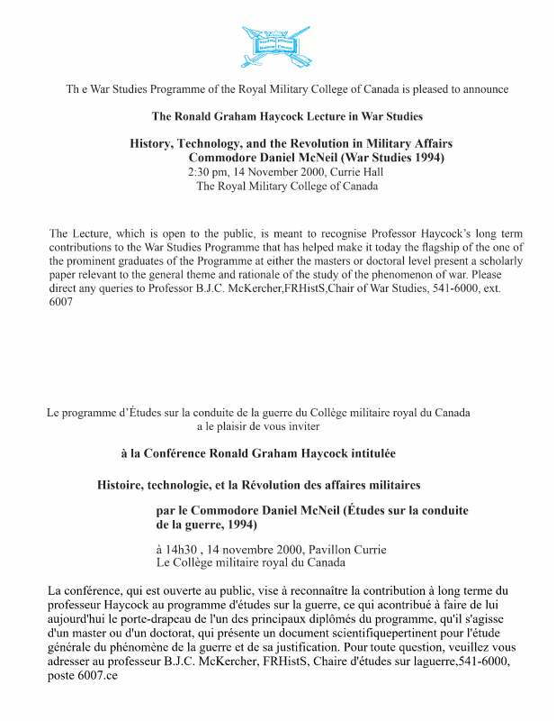 La conférence, qui est ouverte au public, vise à reconnaître la contribution à long terme du professeur Haycock au programme d'études sur la guerre, ce qui a contribué à faire de lui aujourd'hui le porte-drapeau de l'un des principaux diplômés du programme, qu'il s'agisse d'un master ou d'un doctorat, qui présente un document scientifique pertinent pour l'étude générale du phénomène de la guerre et de sa justification. Pour toute question, veuillez vous adresser au professeur B.J.C. McKercher, FRHistS, Chaire d'études sur la guerre, 541-6000, poste 6007.