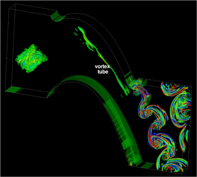 Cette image montre la déformation d'un bloc uniforme de turbulence donnant des tubes de vorticités dans une grille d'aube d'essai de turbine haute pression. L'image fut générée par une simulation numérique directe ayant un maillage de 80 million de nœuds.