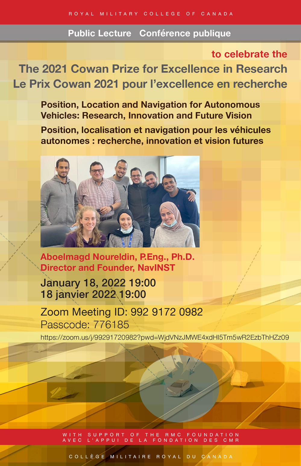 Le mardi 18 janvier 2022 à 19 h, Aboelmagd Noureldin, Ph. D., présentera par zoom la conférence publique du Prix Cowan pour l’excellence en recherche : Position, localisation et navigation pour les véhicules autonomes : recherche, innovation et vision futures. Le recteur et la vice-rectrice à la recherche aimeraient inviter tous les membres de la communauté du CMR à se joindre à Aboelmagd Noureldin pour célébrer ses réussites. Nous tenons à remercier la Fondation des CMR pour son soutien.